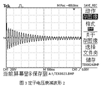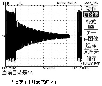 三相電動(dòng)機正常運行時(shí),以同步轉速旋轉的主磁場(chǎng)在定子三相繞組內感應對稱(chēng)的三相電動(dòng)勢。若斷開(kāi)電源后,主磁場(chǎng)消失,但曾經(jīng)被主磁場(chǎng)磁化的轉子鐵芯依然存在剩磁,與此同時(shí)由于慣性轉子依然高速旋轉,在定子線(xiàn)圈產(chǎn)生的感應電動(dòng)勢并不會(huì )在極短的時(shí)間內消失,只是有所衰減。圖2是一37KW電機兩相之間,在斷開(kāi)變頻器輸出前、后的的定子繞組的電壓波形,由此可看出,斷開(kāi)電源后定子線(xiàn)圈的感應電動(dòng)勢逐漸衰減的過(guò)程。圖3是圖2的展開(kāi),仔細觀(guān)察該圖可以看出,隨著(zhù)轉速的降低,轉子繞組電壓頻率也在緩慢的下降。