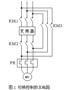 變頻運行的電動(dòng)機切換成工頻運行的主電路如圖1所示。切換的基本過(guò)程只有2個(gè):