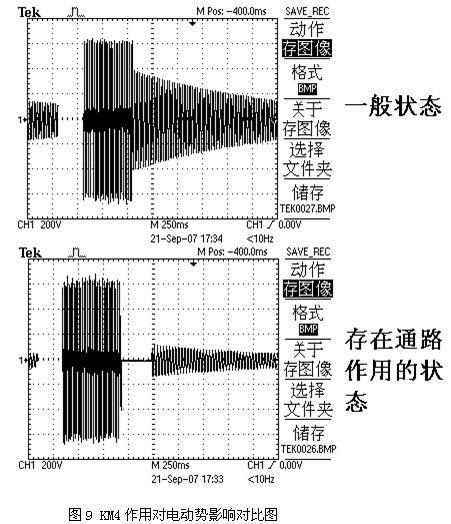 KM4作用對電動(dòng)勢影響對比圖。由圖9可以看出,KM4提供通路的作用時(shí)間約為300ms,作用后該時(shí)刻與一般狀態(tài)同一時(shí)刻的感應電動(dòng)勢幅值相比幅值小了很多。適當控制KM4的作用時(shí)間,讓其幅值減小到額定電壓的三分之一以下就可以了。這樣,即使切換至工頻電源時(shí)刻感應電動(dòng)勢與工頻電源的相位相差180°,△U也不會(huì )超出其許可的安全范圍了。在KM4的作用過(guò)程中,會(huì )加快電機的轉速下降,但通過(guò)試驗得知,KM4的作用對電機轉速的影響比對感應電動(dòng)勢幅值的影響要顯得多。
