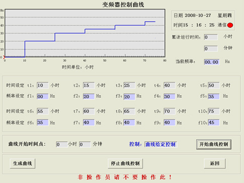 黃原膠工作周期約為69~72小時(shí),攪拌額定速度為120r/min。在每個(gè)發(fā)酵工作周期,為多級調速,運行頻率一般設定為20 Hz、30Hz、35 Hz、40Hz、45Hz左右。具體發(fā)酵過(guò)程共分十個(gè)時(shí)間段(單位:小時(shí))和十個(gè)頻率段(單位:Hz),設定界面如圖4所示。