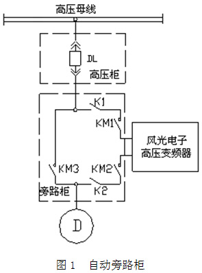 旁路柜主要配置:三個(gè)真空接觸器(KM1、KM2、KM3)和兩個(gè)刀閘隔離開(kāi)關(guān)K1、K2。KM2與KM3實(shí)現電氣互鎖,當KM1、KM2閉合,KM3斷開(kāi)時(shí),電機變頻運行;當KM1、KM2斷開(kāi),KM3閉合時(shí),電機工頻運行。另外,KM1閉合時(shí),K1操作手柄被鎖死,不能操作;KM2閉合時(shí),K2操作手柄被鎖死,不能操作。
