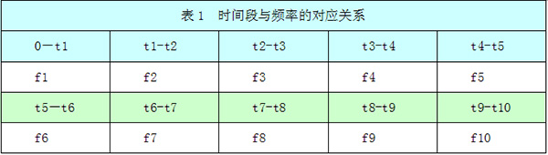 變頻器運行中根據實(shí)際運行時(shí)間自動(dòng)選擇應該運行的時(shí)間段,然后將運行頻率調整至該時(shí)間段對應的頻率,時(shí)間段與頻率的對應關(guān)系如表1示: