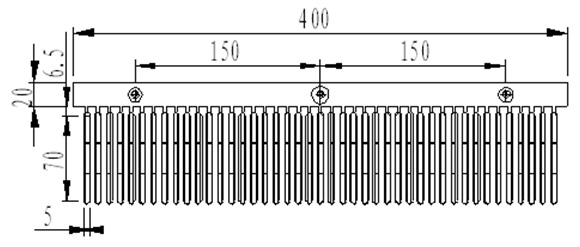 按照器件均勻布置的原則,所需散熱片寬度約為300~400mm,選400mm;長(cháng)度約為450~600mm.選480mm。