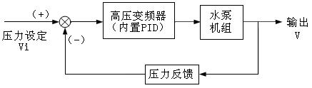 由于永州市零陵區自來(lái)水公司,對用水負荷需要在實(shí)際運行時(shí)進(jìn)行精確調整和測量,因此采用的是恒壓供水系統,其工作原理如圖3所示,測量元件為壓力傳感器,將它設在水泵機組出水口,Vi為恒定供水壓力設定值,供水壓力V作為輸出量,構成閉環(huán)控制系統。變頻器內部的PLC采集供水壓力值V與用戶(hù)給定值Vi進(jìn)行比較和運算,通過(guò)PID進(jìn)行調整,將結果轉換為頻率調節信號送至變頻器,直至達到供水壓力的給定值Vi。不管系統供水流量如何變化,供水壓力值V始終維持在給定壓力值Vi附近。