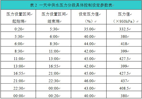 現場(chǎng)采用壓力閉環(huán)控制,每天分十個(gè)時(shí)間段來(lái)控制給定壓力,具體設定壓力分段如表2所示。