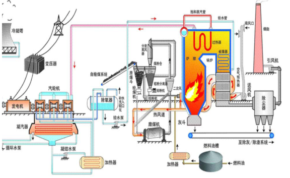 電廠(chǎng)主要組成:風(fēng)系統、燃料輸送系統、給水蒸汽系統、冷卻系統。鍋爐是一個(gè)換熱器,主要由爐膛、水冷壁、過(guò)熱器、省煤器、空氣預熱器組成。