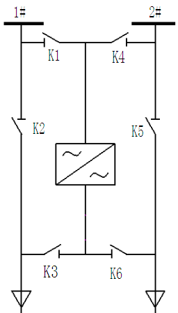 吉林某水務(wù)集團結合該自身的實(shí)際情況,為滿(mǎn)足泵站的安全運行需求,要求水泵電機一用一備設置,因此選擇了新風(fēng)光JD-BP38系列高壓變頻調速系統中一拖二手動(dòng)運行的主回路,主回路圖如圖3所示。其中K1刀閘與K4刀閘互鎖,保證兩路高壓電源不會(huì )同時(shí)作用于變頻回路;K2刀閘與K3刀閘互鎖,保證工頻電源與變頻電源不會(huì )同時(shí)作用于電機M1;K5刀閘與K6刀閘互鎖,保證工頻電源與變頻電源不會(huì )同時(shí)作用于電機M2.