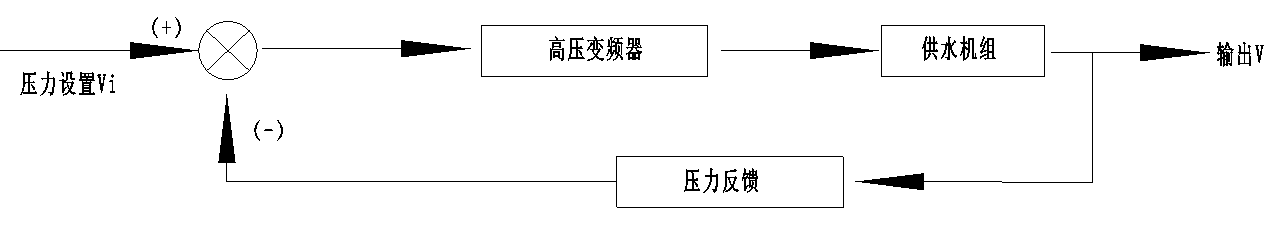 為滿(mǎn)足不同時(shí)段不同地區的用水壓力需求,該水廠(chǎng)采用先進(jìn)的恒壓供水控制系統,可以對水廠(chǎng)出口處的水壓值V進(jìn)行精確的處理和控制,并與壓力設置值Vi構成閉環(huán)控制系統。恒壓供水系統原理如圖2所示。變頻器內部的主控DSP采集供水壓力值V與用戶(hù)給定值Vi進(jìn)行比較和運算,通過(guò)PID進(jìn)行調整,將結果轉換為頻率調節信號送至變頻器,直至達到供水壓力的給定值Vi。不管系統供水流量如何變化,供水壓力值V始終維持在給定壓力值Vi附近。
