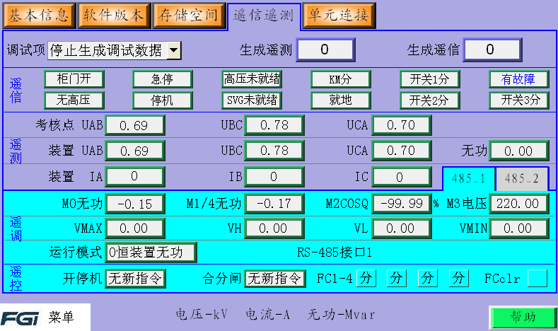 現場(chǎng)與后臺的通訊調試主要是SVG與后臺的信號與操作命令的傳輸。包括SVG傳給后臺的遙信、遙測信號以及后臺控制SVG的遙調、遙控指令??赏ㄟ^(guò)人機界面的“信息查詢(xún)”/“遙信遙測”界面模擬生成數據,每個(gè)地址里生成不同的數據,在界面上觀(guān)測看到的數據是否與生成的一致進(jìn)行對比調試。如圖4所示。