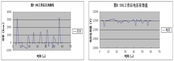SVG運行后無(wú)功功率補償效果較好,軋鋼機運行最大功率時(shí)偶爾出現3000kvar左右無(wú)功功率,此時(shí)有功功率大約11000kW以上,總體功率因數計算下來(lái)也滿(mǎn)足要求。由于濾波器支路與部分FC支路容量超過(guò)SVG總額定容量,因此在廠(chǎng)內負載較小時(shí)會(huì )出現過(guò)補現象,但是過(guò)補容量時(shí)間較少并且功率不超過(guò)-700kvar,因此總體上也滿(mǎn)足功率因數的要求。