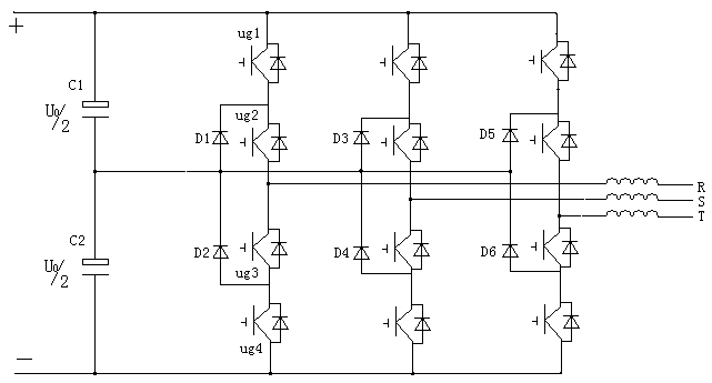 當裝置功率大時(shí),需要這樣幾個(gè)主電路并聯(lián),并聯(lián)時(shí)需考慮均流與環(huán)流及其相位問(wèn)題,同時(shí)采用二極管鉗位的三電平電路需考慮直流端電容中點(diǎn)電位不平衡問(wèn)題,在軟件PWM波生成電路中尤其注重此點(diǎn)。